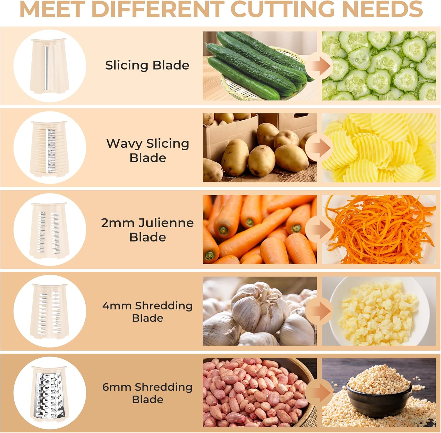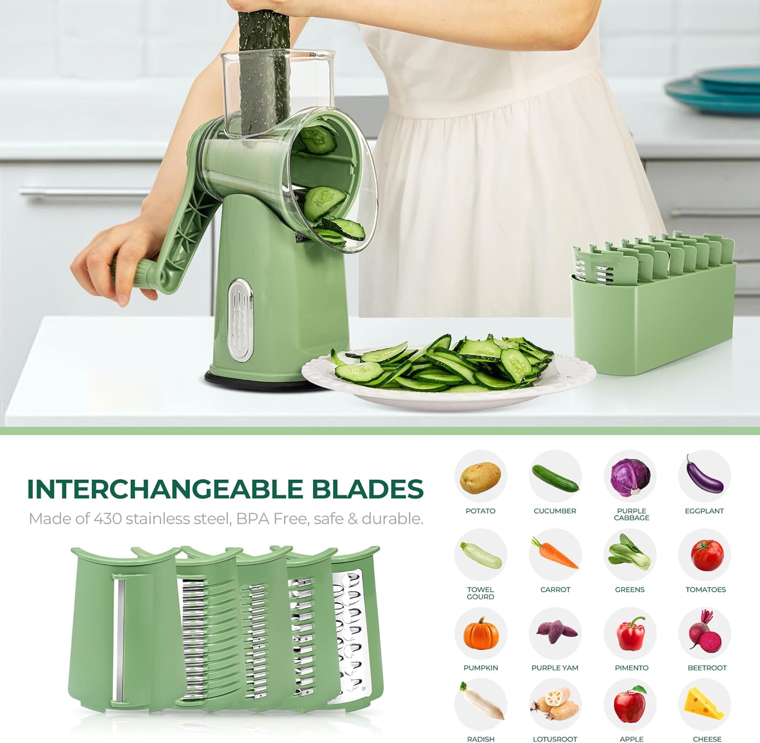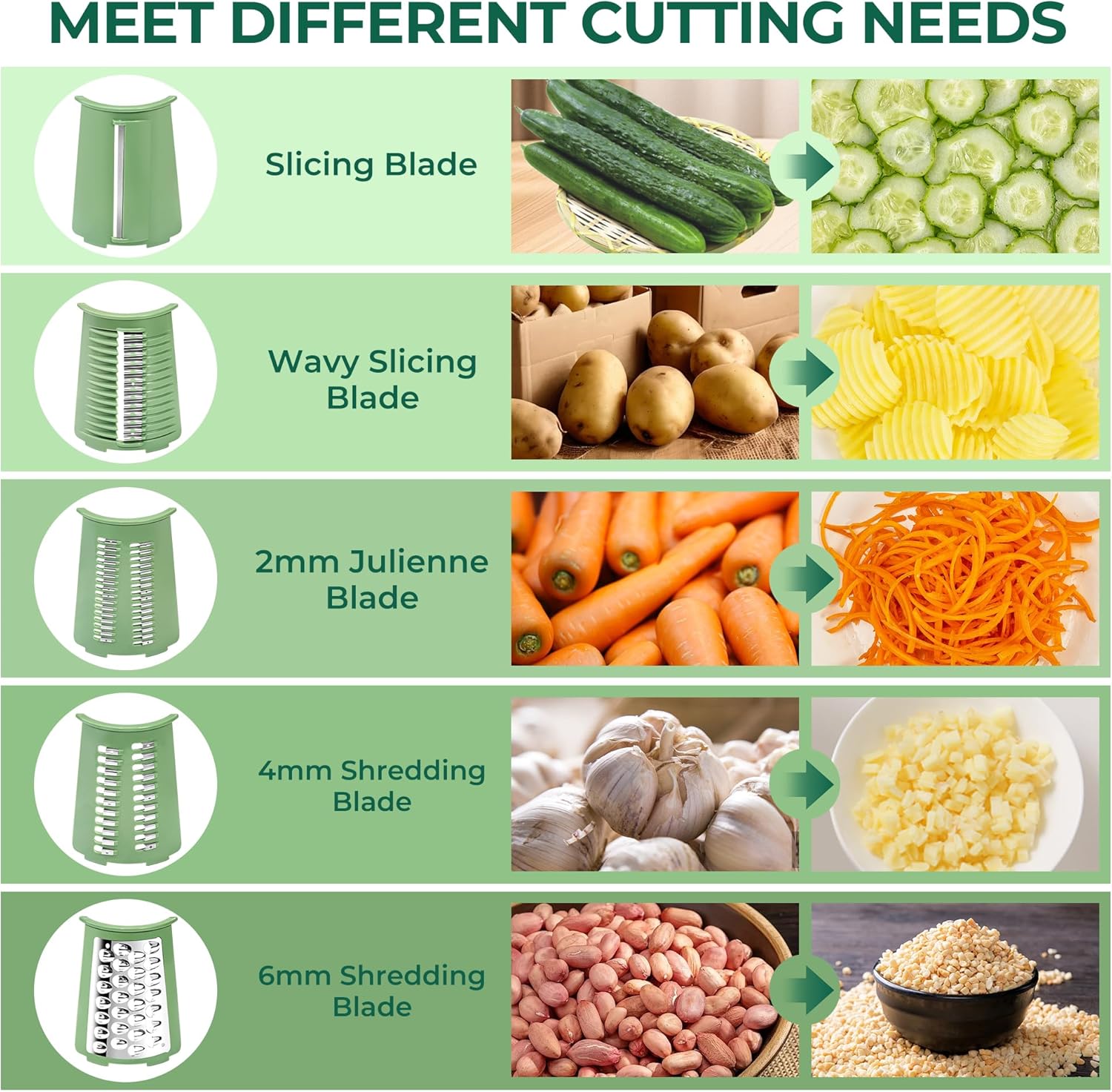 - Inkl. 5 verschiedene Wechselklingen in einer praktischen Aufbewahrungsbox: Schneiden, Häckseln, Würfeln, Hobeln und Raspeln.